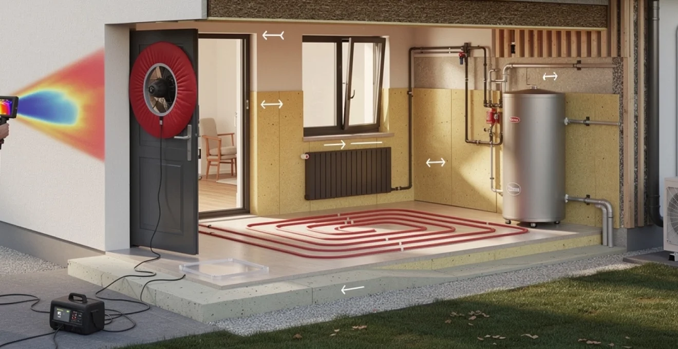 Le test d’étanchéité à l’air, couramment appelé Blower Door, constitue un élément clé de l’audit énergétique pour quantifier les infiltrations parasites d’air. Conformément à la norme NF EN 13829, un ventilateur est installé dans l’encadrement d’une porte extérieure afin de mettre le bâtiment en dépression ou en surpression. En mesurant le débit de fuite nécessaire pour maintenir un écart de pression de 50 Pa entre l’intérieur et l’extérieur, on obtient un indicateur normalisé de perméabilité à l’air, exprimé en m³/h.m² de paroi froide ou en volume/h.